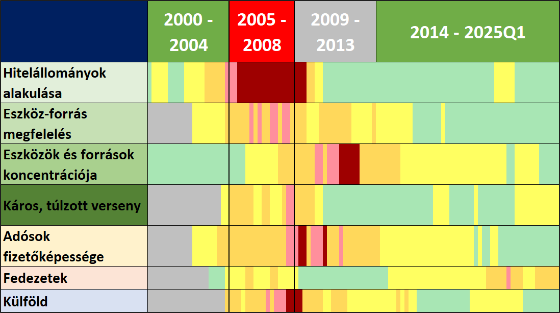 A ciklikus rendszerkockázati térkép (CRKT) az elmúlt egy évben a ciklikus rendszerkockázatok alacsony szinten történő stagnálását mutatták, azzal, hogy a pénzügyi stabilitást veszélyeztető, túlzott versenyt, valamint a befektetési eszközök (pl. fedezetek) túlértékeltségét mérő kategóriák emelkedett kockázatot jeleztek (1. ábra). A „túlzott, pénzügyi stabilitást veszélyeztető hitelintézeti verseny” kategória mérsékelt (sárga) kockázatot jelez, főként a lakossági hitelkamatfelárak alacsony és a banki jövedelmezőség magas értéke miatt. Az emelkedett kockázati jelzést indokolja, hogy az alacsony kamatfelár, valamint a magas jövedelmezőség nem fenntartható, túlzott piaci kockázatvállalást is jelenthetne. Az aktuális kockázati jelzések azonban az emelkedett kamatkörnyezetből eredő, a forrásköltségekhez mérten alacsony lakáshitel kamatfelárakra, valamint a betétfinanszírozás magas arányából következő hitelnyújtói „kamatfedezettségből” eredő erős jövedelmezőségre és nem túlzott kockázatvállalásra utalnak. Vagyis az alacsony hitelkamatmarzsot a bankok az alacsony betéti kamattal kompenzálják. A közepes (narancs) kockázatot jelző „befektetési eszközök túlértékeltsége” kategórián belül a lakáspiaci kockázatokhoz kötődő, valamint a háztartások kockázatos pénzügyi eszközökbe, főként befektetési alapokba történő befektetéseket mérő indikátorok (fedezetek) mutatnak emelkedett szinteket. A CRKT jelzései kapcsán az emelkedett lakáspiaci kockázatok előretekintve, tartósan is fennmaradhatnak, így továbbra is fokozott monitoringot indokolnak.