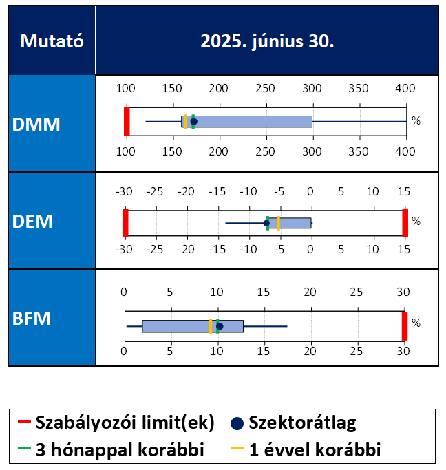 A 2025. január 1-jétől hatályba lépett zöld adósságfék módosítás a kockázatok növelése nélkül biztosíthatott célzott támogatást a zöld hitelezés térnyeréséhez. A magasabb, 80-90 százalékos HFM mozgásteret (zöld HFM limit) kihasznált zöld lakáshitelek aránya mintegy 2 százalék, amiből 0,4 százalékpontot tesz ki a nem elsőlakás-vásárlóknak nyújtott zöld lakáshitel. Így a zöld HFM limitet a potenciálisan jogosult zöld lakáshitelek mintegy 7,5 százaléka esetén használták ki a hitelfelvevők. A zöld HFM limitet kihasználó, nem elsőlakás-vásárló, zöld lakáshitelt felvevők JTM számításhoz figyelembe vett jövedelme átlagon felüli, átlagosan mintegy havi nettó 1,45 millió forint. Így ezen hitelek kockázata a magasabb jövedelem miatti kisebb nemteljesítési valószínűség és az ingatlanok potenciálisan magasabb értékállósága okán érdemben alacsonyabb lehet.