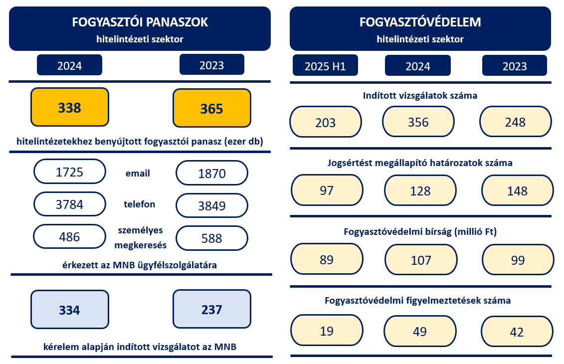 Az MNB fogyasztóvédelmi tevékenysége részeként folyamatosan értékeli a fogyasztókat érintő aktuális kockázatokat hozzájárulva ezzel a pénzügyi rendszerbe vetett bizalom és a pénzügyi stabilitás megőrzéséhez. 2024-ben csökkent az MNB eljárását kérő hitelintézeti ügyfelek száma. Az MNB hiányosságokat azonosított a késedelemmel érintett jelzáloghitel-szerződések felmondását megelőző intézményi tájékoztatások területén. A pénzforgalmi visszaélések számának elmúlt időszaki növekedése okán az MNB hatósági feladatkörében kiemelten foglalkozik pénzügyi visszaélések megelőzésével.