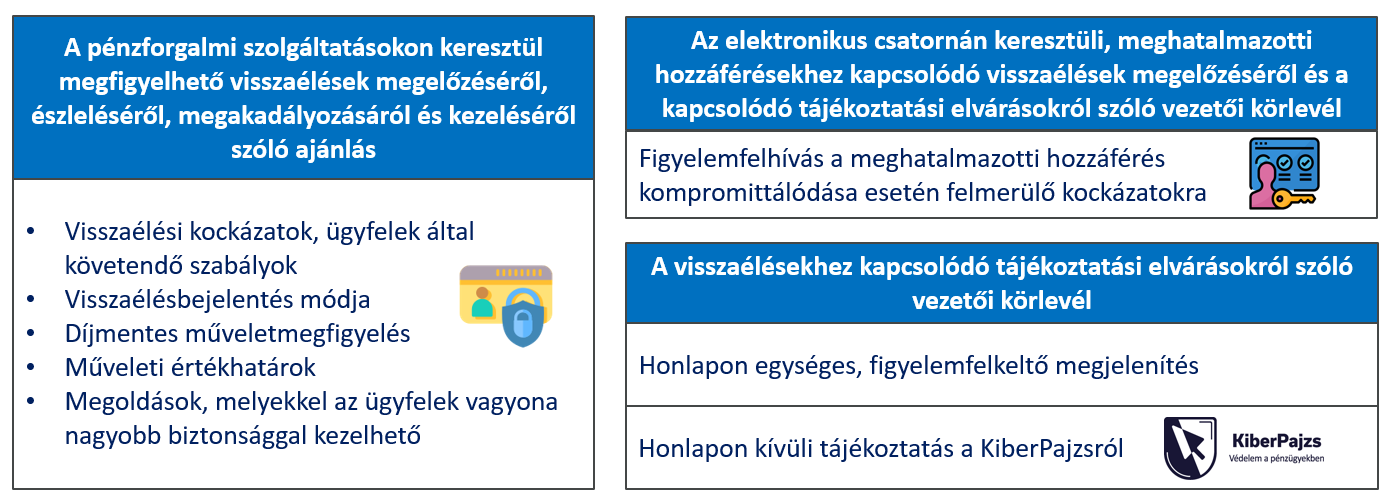 A pénzforgalmi szolgáltatásokon keresztül megfigyelhető visszaélésekhez kapcsolódó tájékoztatási elvárásokról szóló vezetői körlevélnek történő megfelelés visszamérése során az MNB – többek között – hiányosságokat tárt fel a hitelintézetek visszaélések megelőzésével, észlelésével, megakadályozásával kapcsolatos információkat rögzítő aloldalaira mutató linkek megjelenítése, a kapcsolódó logók elhelyezése, az aloldalak szerkezeti kialakítása és tartalma, a fogyasztóknak küldött közvetlen tájékoztatások, hirdetések tartalma, valamint az internetbanki, illetve mobilbanki csatornák felfüggesztésének, letiltásának lehetőségével kapcsolatban nyújtott tájékoztatás tekintetében. Mindemellett az Ajánlásban foglalt tájékoztatási elvárások ellenőrzése során az MNB kisebb hiányosságokat azonosított az azonnali tranzakciók monitorozásának lehetőségéről és a tranzakciós limitekről, valamint az ügyfelek vagyonának biztonságosabb kezelésére rendelkezésre álló megoldási lehetőségekről történő tájékoztatás kapcsán. Az MNB továbbá szükség esetén felhívta a bankok figyelmét az elektronikus csatornán keresztüli, meghatalmazotti hozzáférésekhez kapcsolódó visszaélések megelőzéséről és a kapcsolódó tájékoztatási elvárásokról szóló vezetői körlevélnek történő megfelelésre. A felhívások nyomán a bankok megtették a szükséges intézkedéseket annak érdekében, hogy megfeleljenek a pénzforgalmi visszaélések megelőzése érdekében (az Ajánlásban és a két hivatkozott körlevélben) megfogalmazott tájékoztatási elvárásoknak.